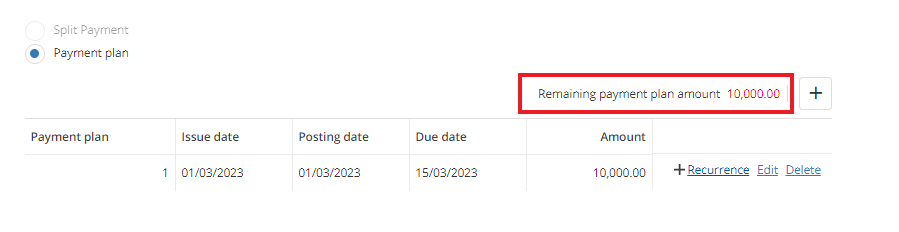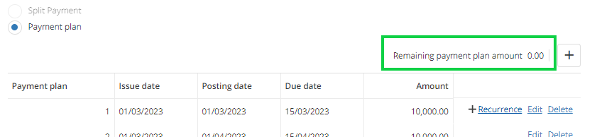 And as you have added 100% of the amount in first line of the payment plan you can see that the remaining amount is now 0,-