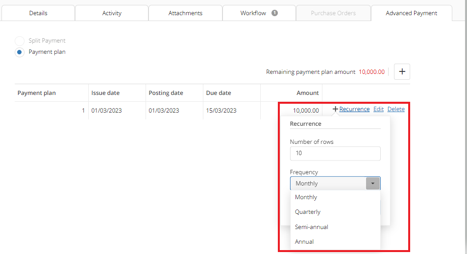 - Monthly - This will add one month to each recurrence to posting date and due date. Issue date and amount will stay the same.