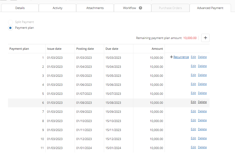 After you hit "create" the payment plan will be generated, and if you find out you want to do some changes or delete some of the payments you can do this before posting.