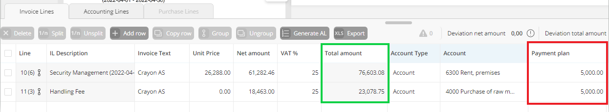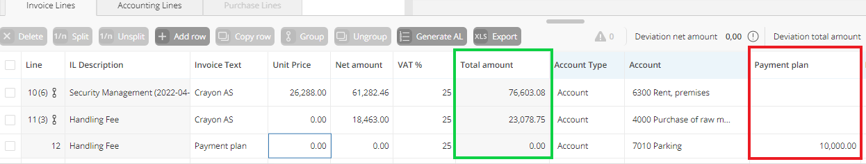 Then you add a new line, make sure the normal total amount is 0,- and add the whole amount for the payment plan to that line: So here will the actual invoice be booked 77%/23% on accounts 6300 and 4000. And the 11 payment plan invoices will be booked on account 7010. So 11 invioces of 10.000,- to account 7010.