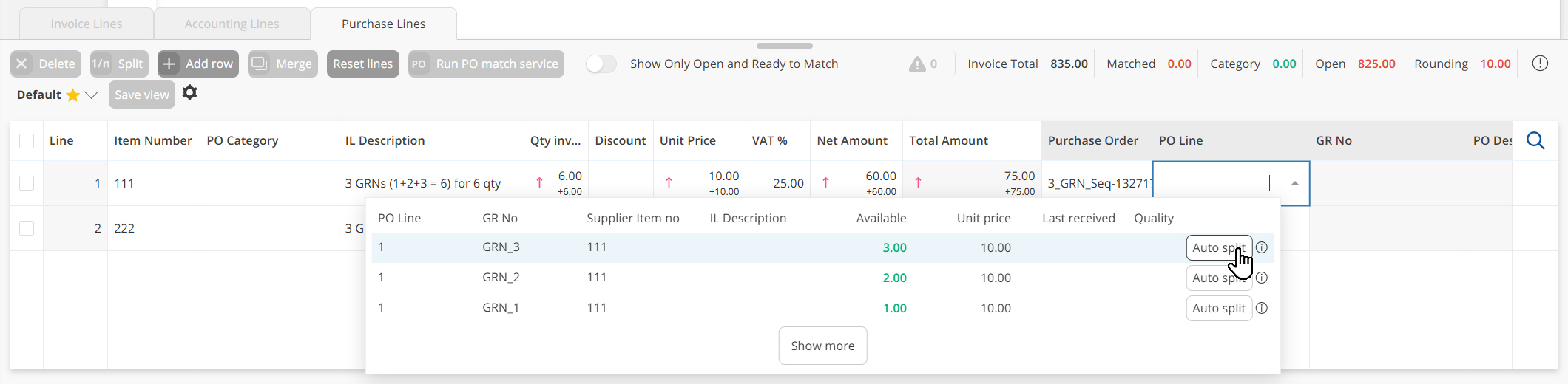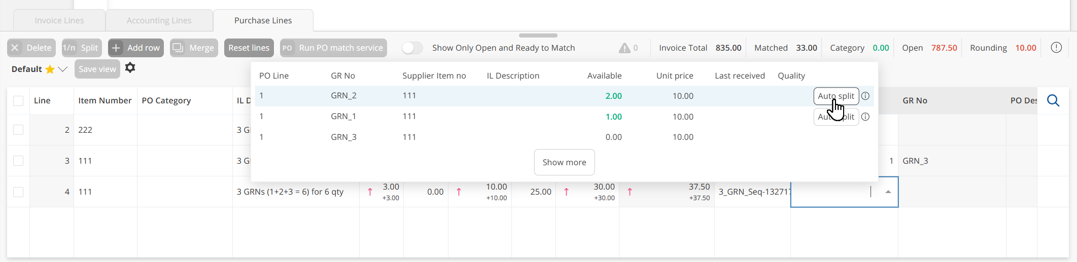- Action: Open the PO Line selector and click "Auto Split" to the right of the PO Line + GRN combination