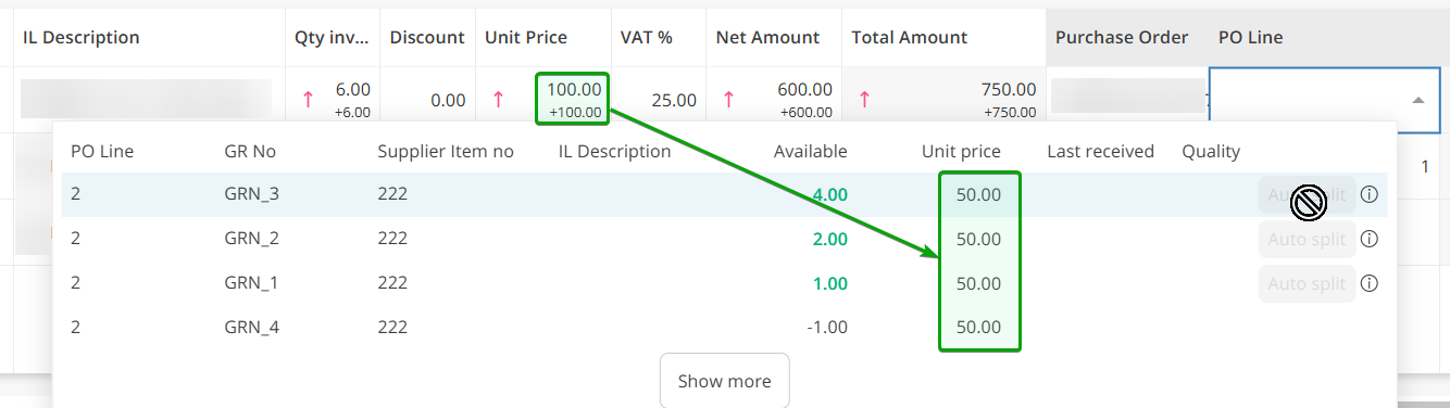 The auto split function will be disabled if the PO line unit price differs by more than +/- 10% from the invoice line unit price. This indicates that the invoice quantity and the PO line quantity may be in a different Unit of Measurement (UoM) or different packaging (not compatible). Consequentially, any such case will have to be adjusted and connected manually but will be addressed in a future update.