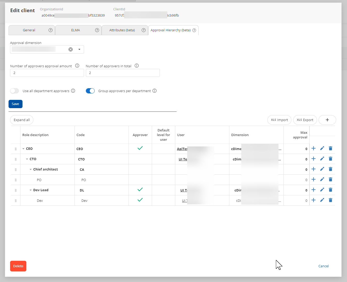 - Forbedringer i visningen av godkjenningshierarkiet. Dette vises nå med bedre redigeringsknapper og meldinger for å hjelpe brukeren. Nivåer som inneholder undernivåer vises i fet skrift. Undernivåer vises med innrykk. ( User Story 38782 )