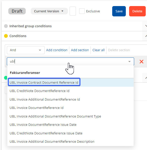 - Det er nå mulig å bruke feltet ubl:Invoice / cac:ContractDocumentReference / cbc:ID i automasjonsbetingelsene i tillegg til EHF / UBL-feltene som allerede ligger der.