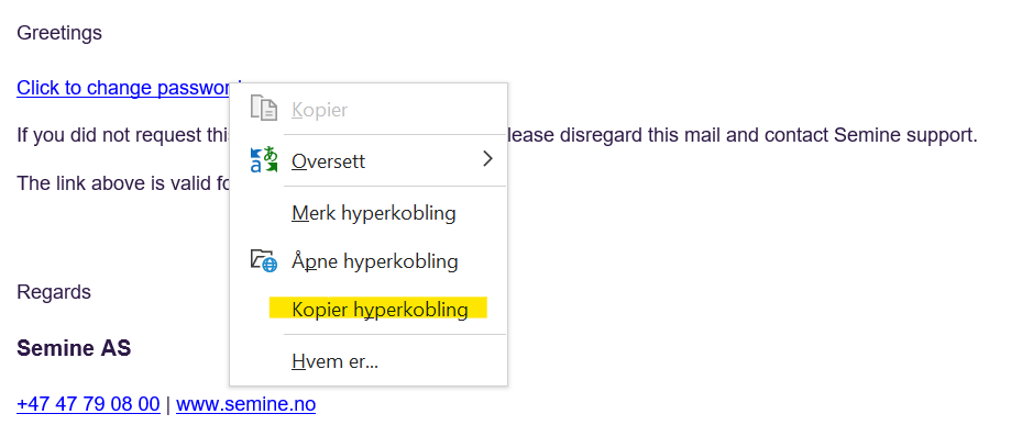 Om du trykker på "Click to change password" og sendes automatisk til feil nettleser (feks. Safari) så kan du enkelt høyreklikke og lime inn lenken i en annen nettleser. Minner om at Semine kun støttes i Microsoft Edge eller Chrome (gjerne oppdater til siste versjon).