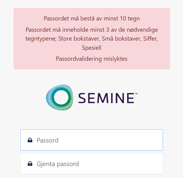 Første gang du logger på SEMINE vil du bli bedt om å opprette et nytt passord. Dette passordet kan bestå av alfanumeriske symboler og punktum.