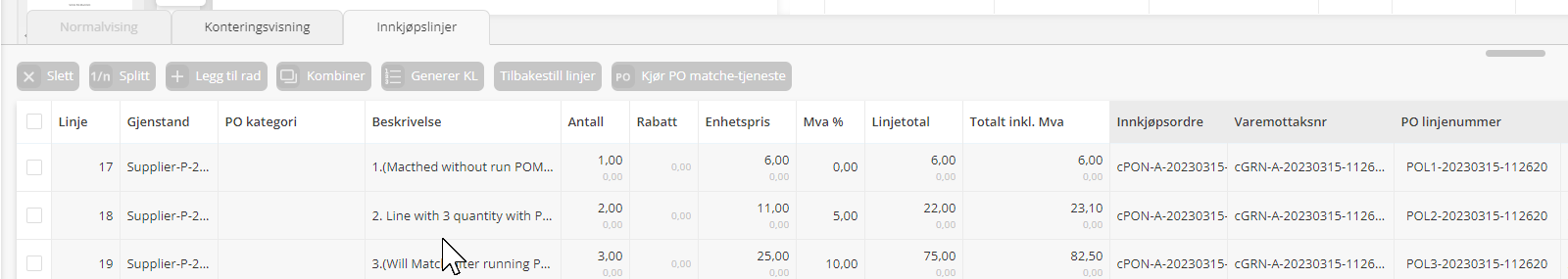 Dette må brukes dersom ERP systemet støtter mottak av konteringslinjer. Når denne funksjonen aktiveres vises en ekstra arkfane med konteringslinjer inne på ordrefakturaen. Ved hjelp av knappen "Generer KL" vil konteringslinjer genereres på samme måte som for kostfaktura. Disse linjene vil kontrolleres (valideres) på samme måte som vanlige konteringslinjer. - Aktiver visning av avvik