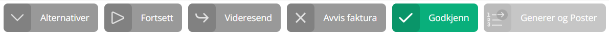 Med denne godkjenner du fakturaen, eller den delen av fakturaen som er tildelt deg, og sender den til neste steg i arbeidsflyten, med mindre du har siste steg. Først når alle arbeidsflyter er godkjent vil fakturaen få statusen "Godkjent". - Generer og poster